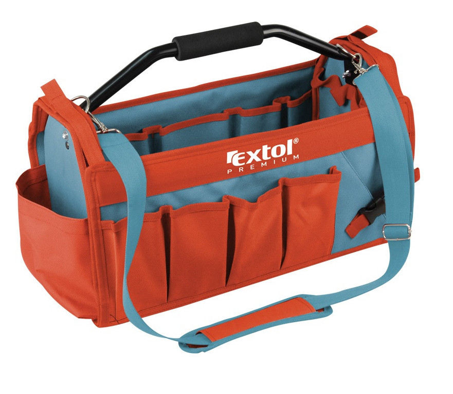 SZERSZÁMTÁSKA, acélcső vázas, 49×23×28cm, 31 zseb, nylon, állítható, párnázott hordpánt+merev acél fogantyú